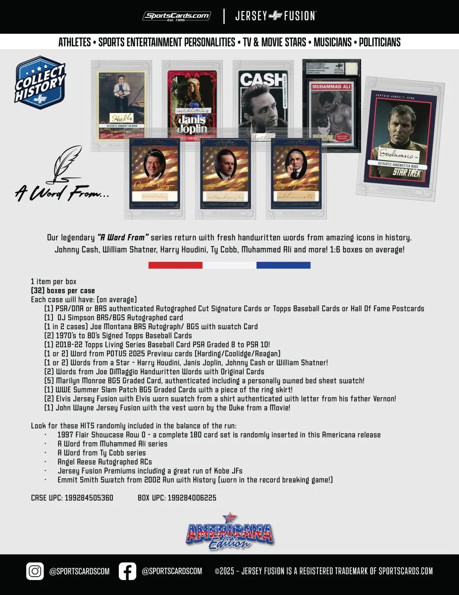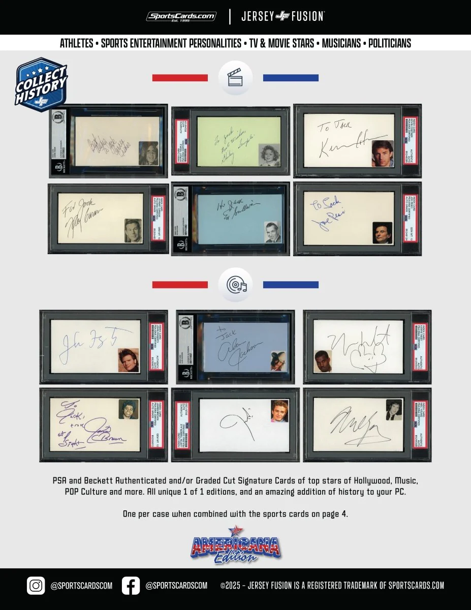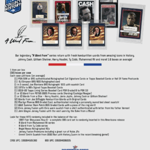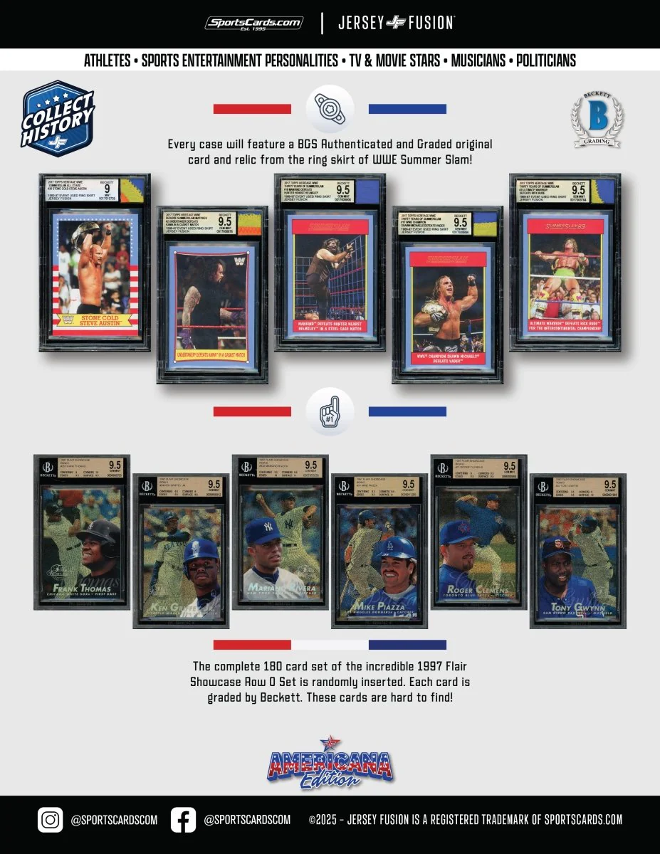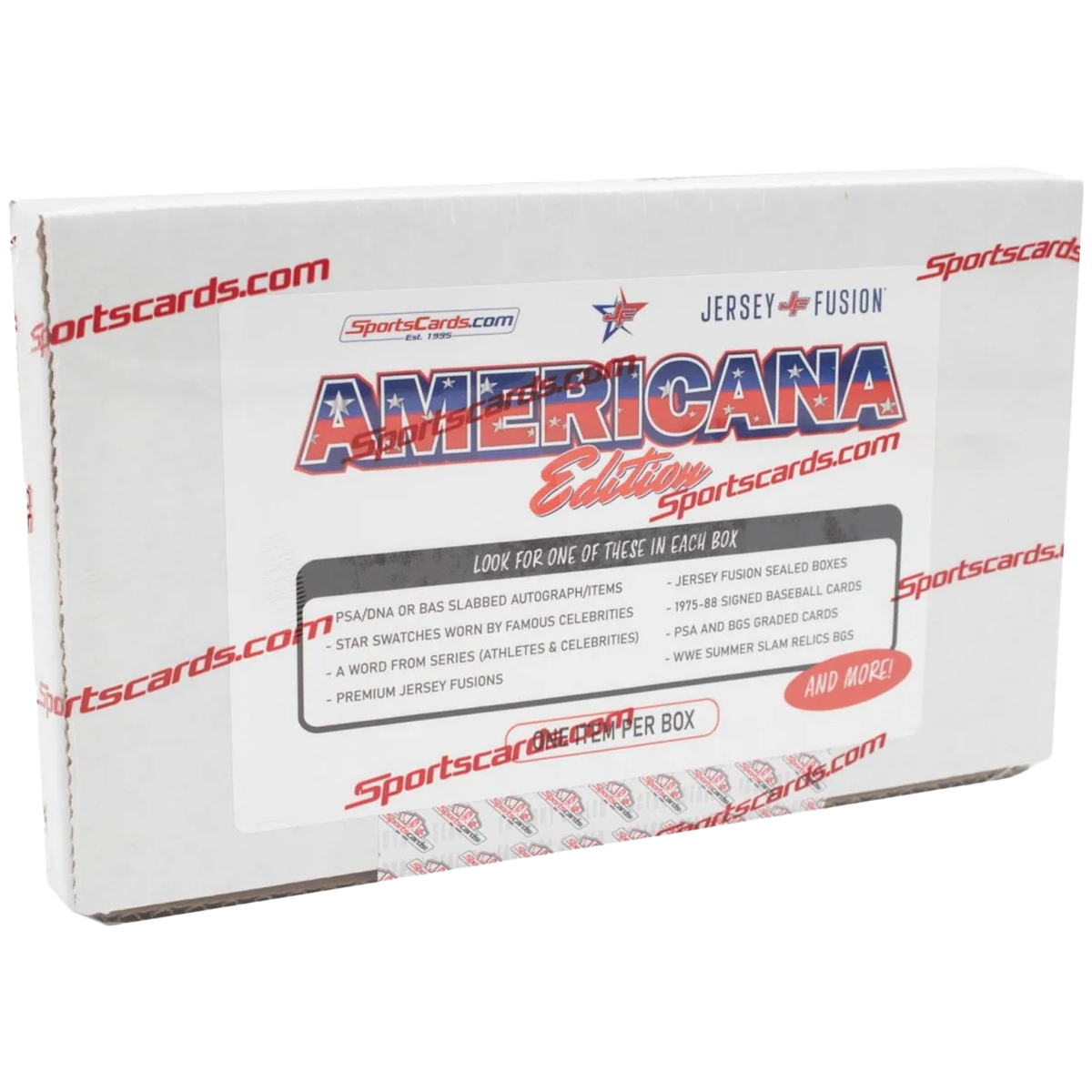 Die Jersey Fusion Americana Edition Box ist ein echtes Überraschungspaket für Sport- und Entertainment-Sammler! Du erhälst 1 hochwertiges Item pro Box – darunter signierte Memorabilia, getragene Star-Outfits, graded Karten und exklusive WWE SummerSlam Relics. Ideal für alle, die das Besondere suchen!