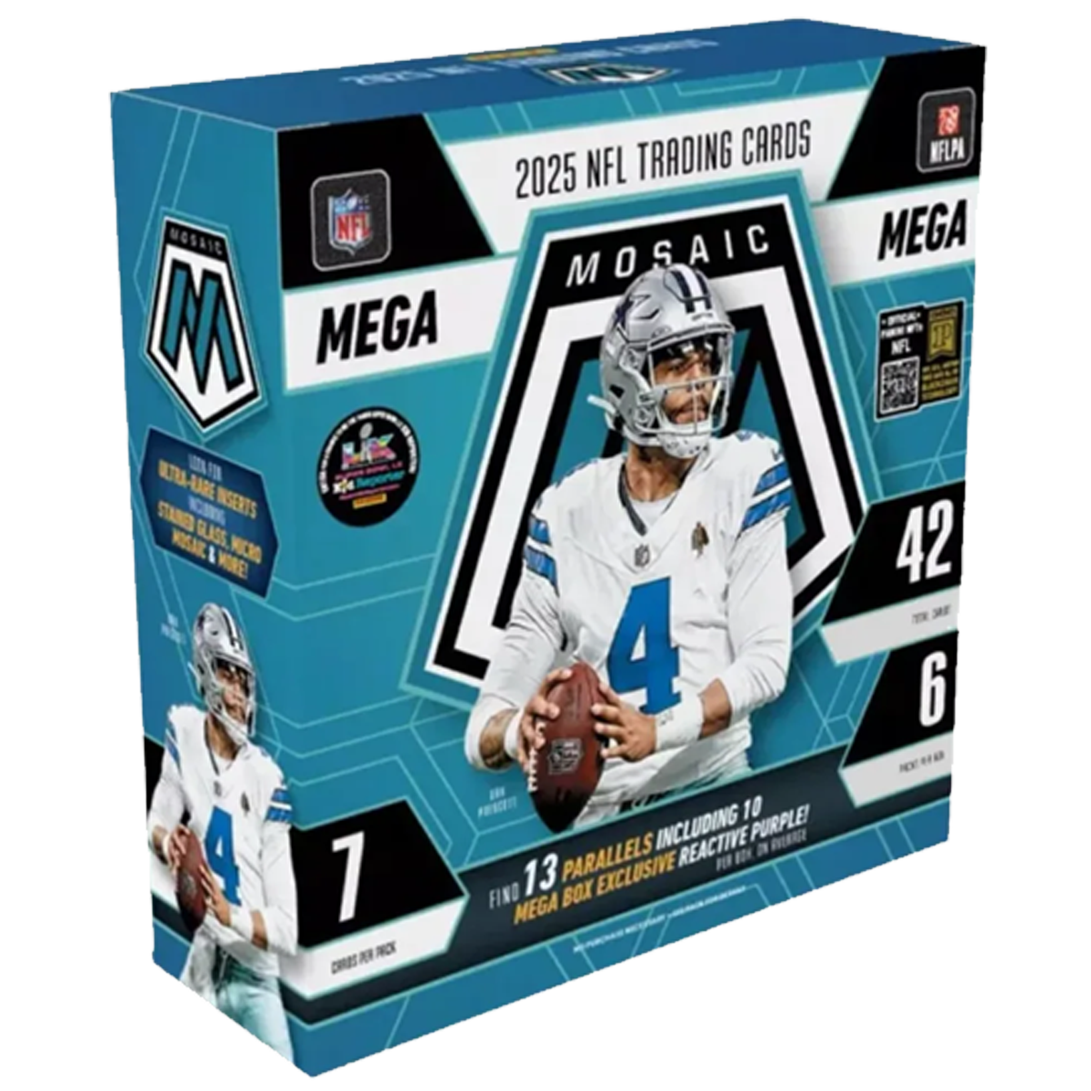 Die 2025 Panini Mosaic NFL Football Mega Box steht für Farbe, Qualität und starke Chase-Karten. Mit ihrem markanten Mosaic-Design und exklusiven Retail-Inhalten ist sie ein echtes Highlight für Fans der NFL.