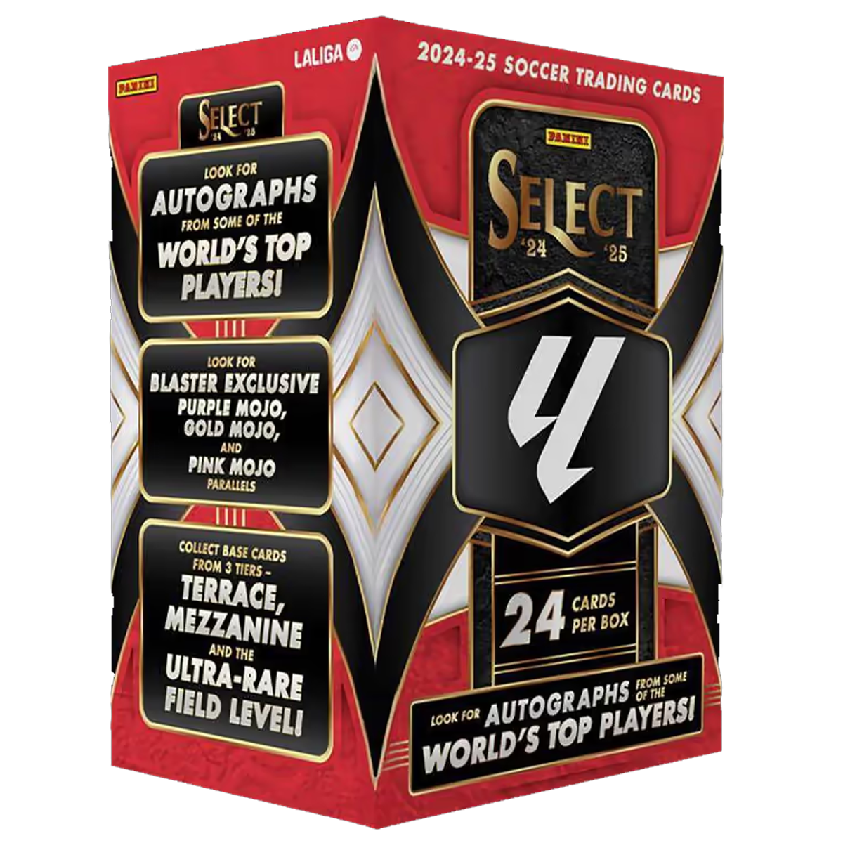 Die Panini Select LaLiga 2024/25 Blaster Box bringt die Stars der spanischen Topliga LaLiga in hochwertigem Select-Design auf Sammelkarten. Jede Box enthält 6 Packs mit je 4 Karten sowie 1 Pink Mojo Parallel, 3 Purple Mojo Parallels und 3 Inserts oder Insert-Parallels. Mit dem 250-Karten-Base-Set und seltenen Inserts wie Stained Glass ist dieses Produkt ideal für Sammler.