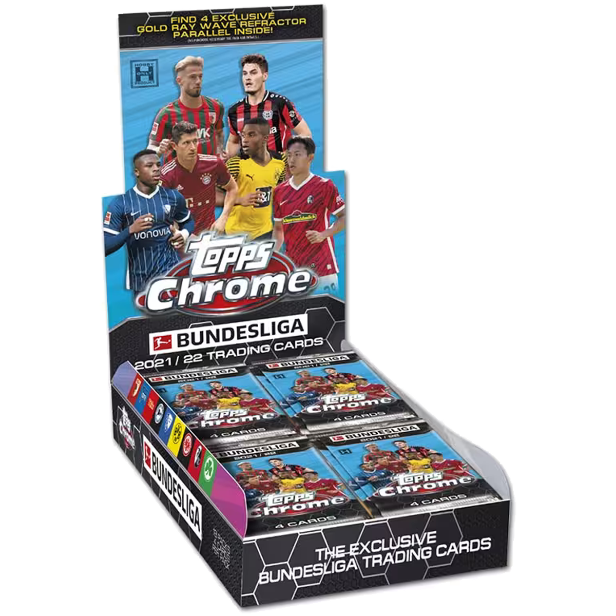 Die 2021-22 Topps Chrome Bundesliga Hobby LITE Box liefert dir exklusive Inhalte mit 5 Refractor Parallels, 4 Gold Ray Wave Parallels und Inserts wie Heroes of Tomorrow und Golden Generation. Mit etwas Glück findest du sogar die streng limitierten Gold Ray Wave Autograph Cards (nur /100, ca. 1:20 Boxen).